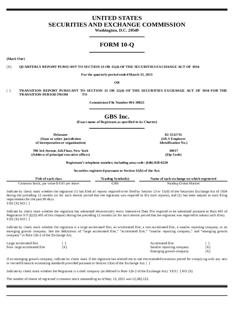 This quarterly report provides an overview of GBS Inc.\'s financial condition, results of operations, and cash flows for the period ended March 31, 2021, including updates on business developments,