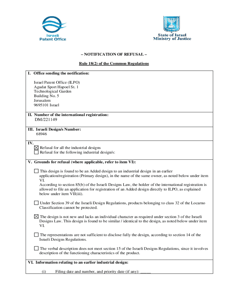 This document serves as a notification of refusal from the Israeli Patent Office regarding the international registration DM/221149 for an industrial design, outlining grounds for refusal and options