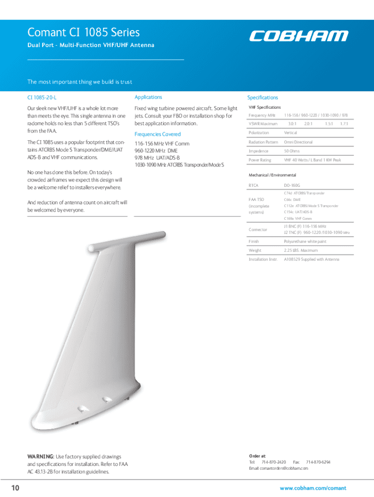 Comant CI 1085 Series Dual Port MultiFunction VHF/UHF AntennaThe most important thing we build is trust CI 108520LApplicationsOur sleek new VHF/UHF is a whole lot more than meets the eye. This single