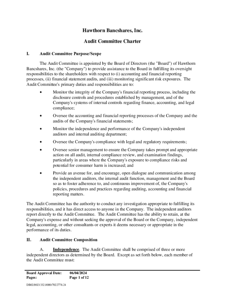 The Audit Committee Charter outlines the purpose, composition, meeting guidelines, responsibilities, and duties of the Audit Committee at Hawthorn Bancshares, Inc., focusing on financial reporting