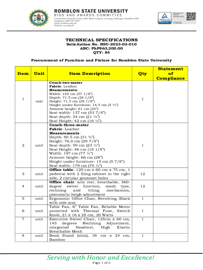 TECHNICAL SPECIFICATIONS Solicitation No. RSU202303010 ABC: PhP863,200.00 QTY: 84 Procurement of Furniture and Fixture for Romblon State UniversityItem1Unitunit2unit3unit4unit5unit6unit7unit8unitItem