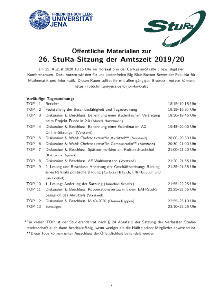 ffentliche Materialien zur26. StuRaSitzung der Amtszeit 2019/20 am 25. August 2020 18:15 Uhr im Hrsaal 6 in der CarlZeissStrae 3 bzw. digitalen Konferenzraum. Dazu nutzen wir den fr uns kostenfreien
