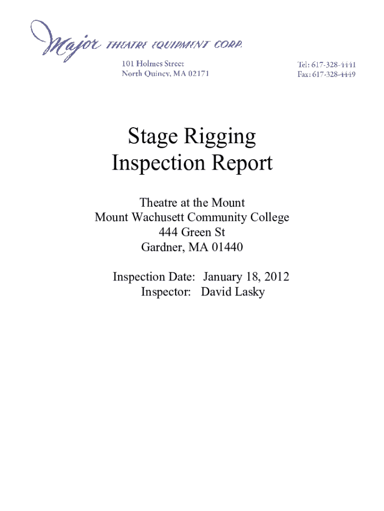 A stage rigging inspection report is a document that outlines the condition and safety of rigging equipment used in theatrical and entertainment settings. It includes findings from inspections performed on rigging systems to ensure they meet safety standards.