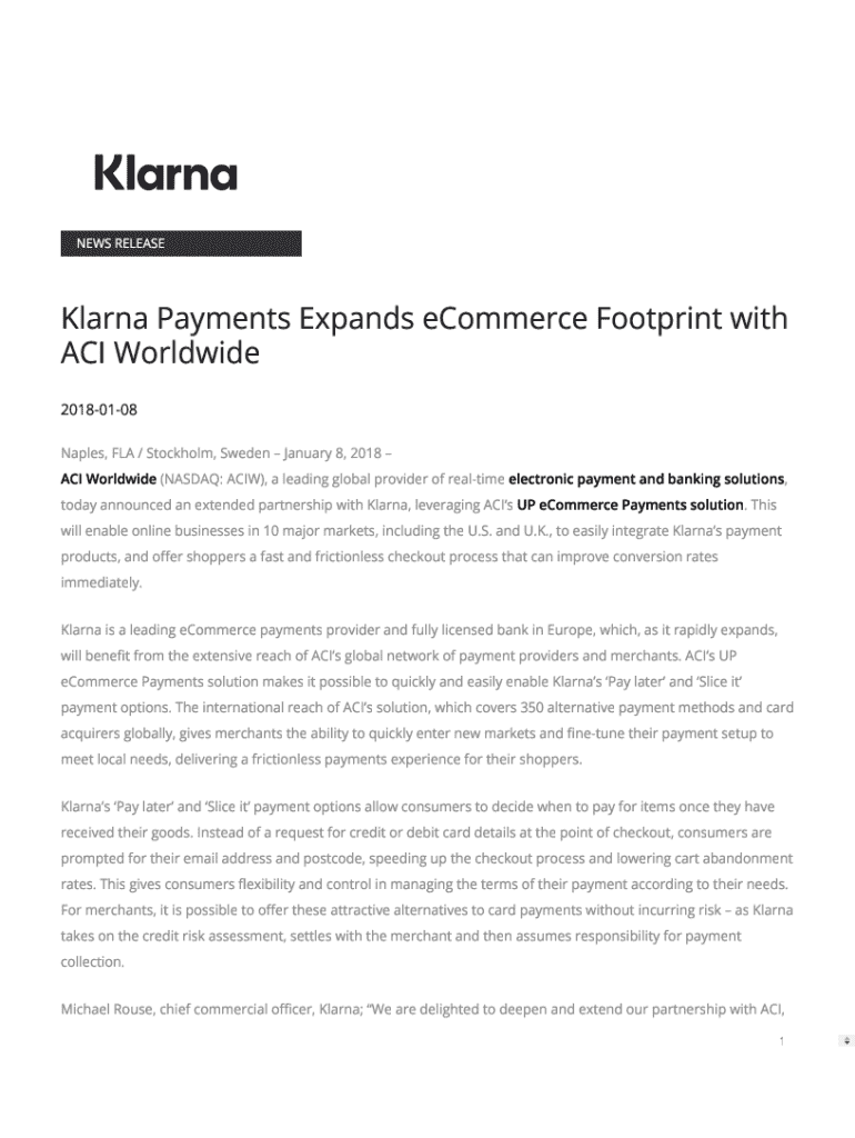 NEWS RELEASEKlarna Payments Expands eCommerce Footprint with ACI Worldwide 20180108 Naples, FLA / Stockholm, Sweden January 8, 2018 ACI Worldwide (NASDAQ: ACIW), a leading global provider of realtime