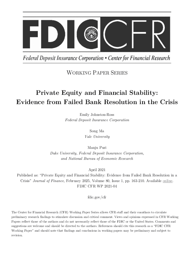 WORKING PAPER SERIESPrivate Equity and Financial Stability: Evidence from Failed Bank Resolution in the Crisis Emily JohnstonRoss Federal Deposit Insurance Corporation Song Ma Yale University Manju