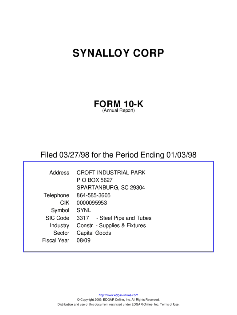 This document provides a comprehensive overview of Synalloy Corporation\'s financial performance and operational activities for the fiscal year ending January 3, 1998. It includes insights into the