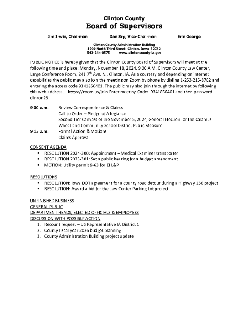 Clinton CountyBoard of Supervisors Jim Irwin, ChairmanDan Srp, ViceChairmanErin GeorgeClinton County Administration Building 1900 North Third Street; Clinton, Iowa 52732 5632440575 www.clintoncountyia.govPUBLIC