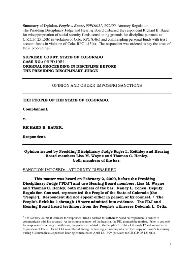 Summary of Opinion. People v. Bauer, 99PDJ051, 5/22/00 Attorney Regulation. The Presiding Disciplinary Judge and Hearing Board disbarred the respondent Richard B. Bauer for misappropriation of social