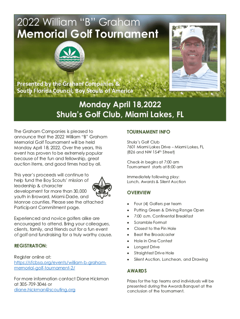 This document is an invitation and registration form for the 2022 William “B” Graham Memorial Golf Tournament, aimed at fundraising for the Boy Scouts’ mission. It includes details on registration,