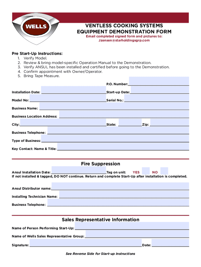 This form is to be completed for the demonstration of ventless cooking systems. It includes pre start-up instructions, verification of equipment installation, and necessary details for the business