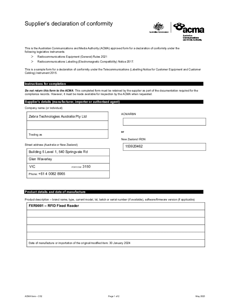 This is the Australian Communications and Media Authority (ACMA) approved form for a declaration of conformity under the Radiocommunications Equipment (General) Rules 2021 and the Radiocommunications