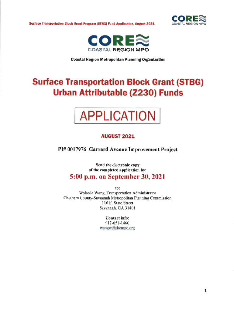 El documento es una solicitud para el programa de subvenciones del Fondo de Bloques de Transporte Superficial (STBG), que incluye información sobre un proyecto de mejora de la Avenida Garrard en
