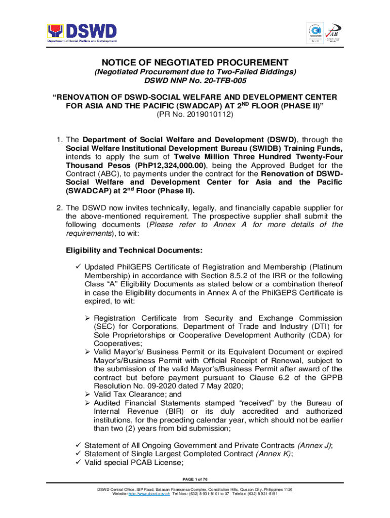 This document outlines the details and requirements for the negotiated procurement contract for the renovation of the DSWD-Social Welfare and Development Center for Asia and the Pacific (SWADCAP)