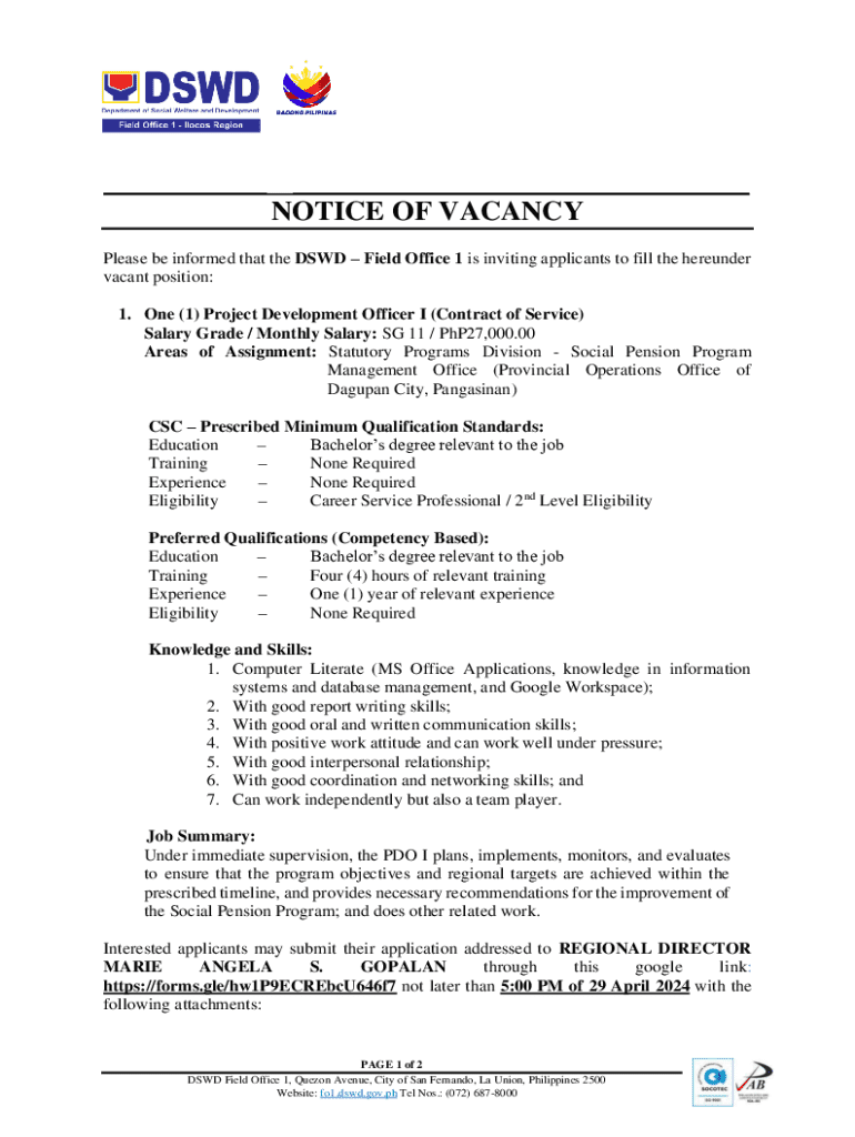 The DSWD – Field Office 1 is inviting applicants for the position of Project Development Officer I under the Social Pension Program Management Office in Dagupan City, Pangasinan. The position requires