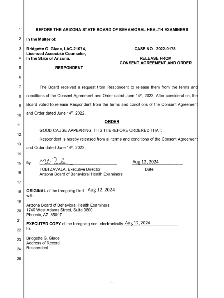 BEFORE THE ARIZONA STATE BOARD OF BEHAVIORAL HEALTH EXAMINERS1 2In the Matter of:3Bridgette G. Glade, LAC21074, Licensed Associate Counselor, In the State of Arizona.4CASE NO. 20220178 RELEASE FROM