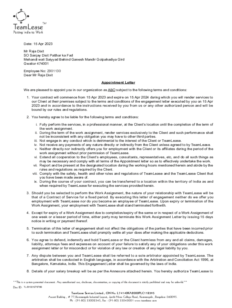 This document serves as the appointment letter for Mr. Raja Dixit, containing the terms and conditions of his employment with TeamLease Services Limited as an ABO for the period from 15 April 2023