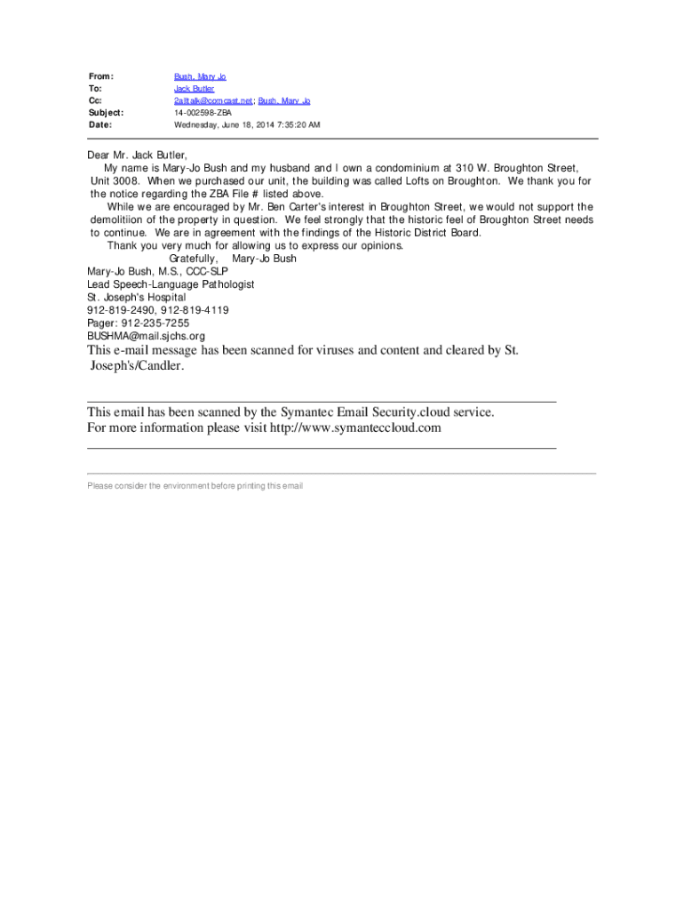 From: To: Cc: Subject: Date:Bush, Mary Jo Jack Butler 2alltalk@comcast.net; Bush, Mary Jo 14002598ZBA Wednesday, June 18, 2014 7:35:20 AMDear Mr. Jack Butler, My name is MaryJo Bush and my husband