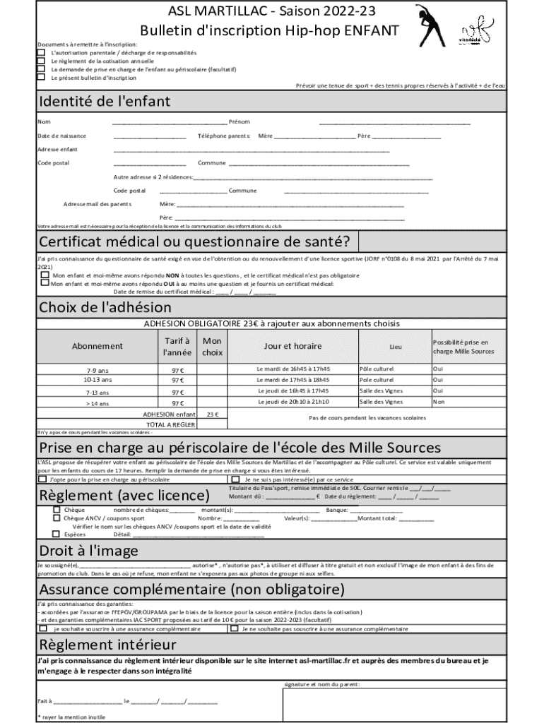 Ce bulletin d\'inscription est destiné aux enfants souhaitant participer aux cours de hip-hop à l\'ASL MARTILLAC pour la saison 2022-23. Il comprend des informations sur la cotisation annuelle,