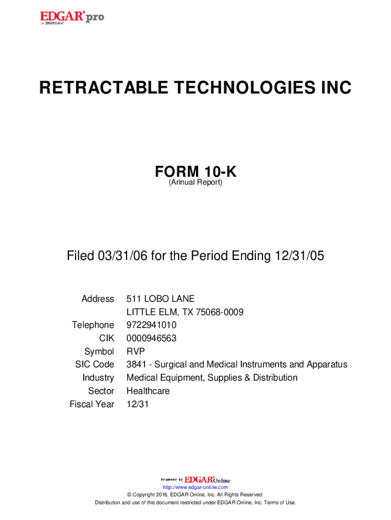 This document is the Annual Report of Retractable Technologies, Inc. for the fiscal year ending December 31, 2005, filed on March 31, 2006. It includes comprehensive financial information, management\'s
