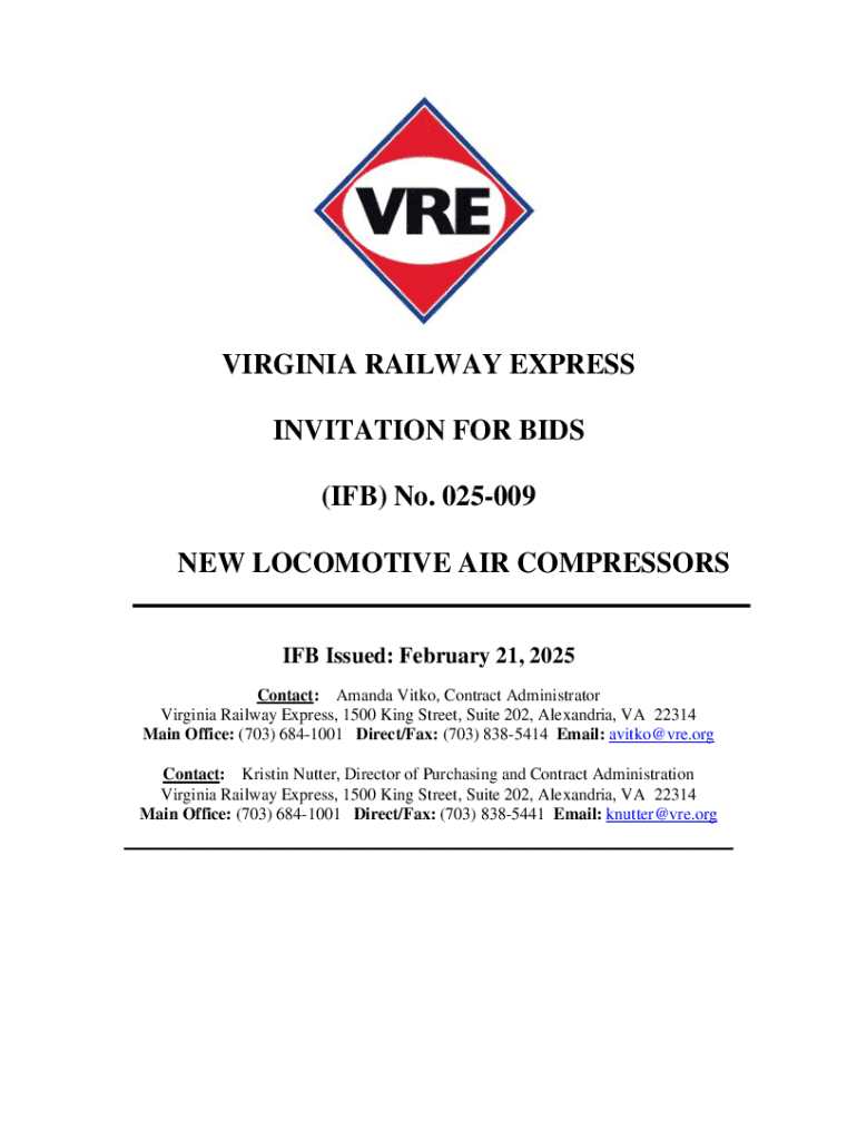 This document is an Invitation for Bids (IFB) issued by the Virginia Railway Express for the provision of new locomotives air compressors for their fleet. It outlines the procurement schedule, instructions
