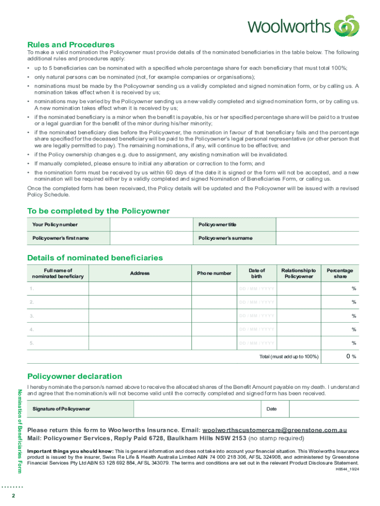 This form allows the Policyowner to nominate beneficiaries to receive allocated shares of the Benefit Amount payable under their Policy upon their death, adhering to specified rules and procedures.