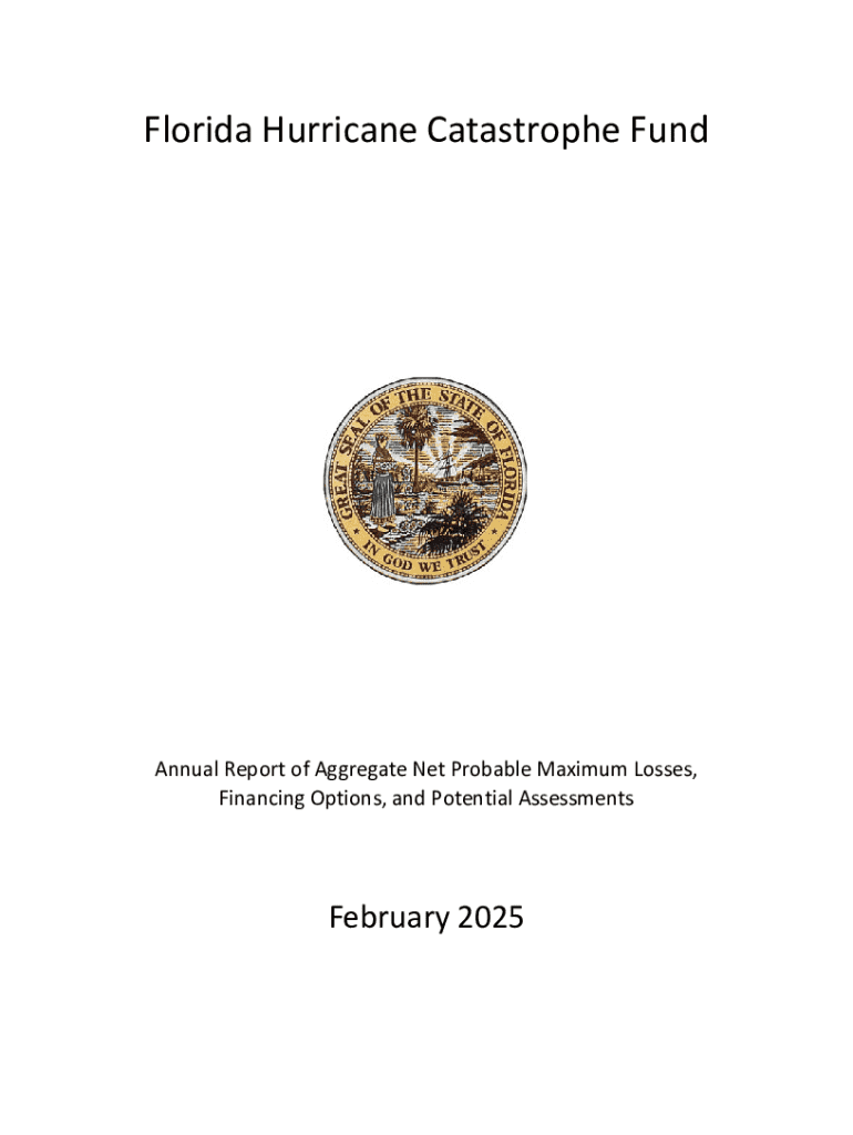 This report provides an analysis of the Florida Hurricane Catastrophe Fund\'s aggregate net probable maximum losses, financing options, and potential assessments for the 2025-2026 contract year. It