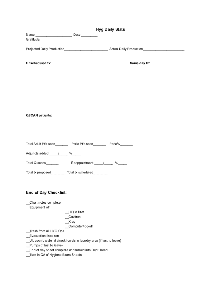 This document outlines the daily statistics, protocols, and responsibilities of a registered dental hygienist at Drive Dental Services, LLC. It includes sections for daily production tracking, patient