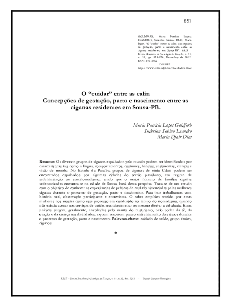 851 GOLDFARB, Maria Patrcia Lopes; LEANDRO, Suderlan Sabino; DIAS, Maria Djair. O cuidar entre as calin: concepes de gestao, parto e nascimento entre as ciganas residentes em SousaPB. RBSE Revista