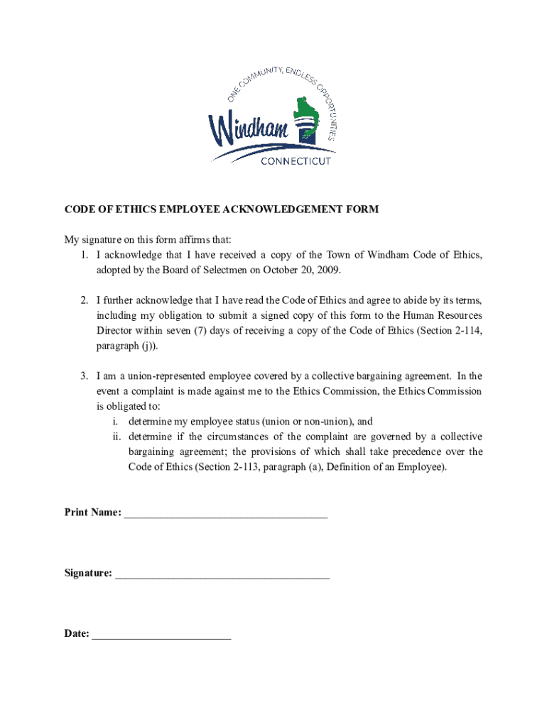 This form serves as an acknowledgment by employees of the Town of Windham regarding receipt and understanding of the Code of Ethics adopted by the Board of Selectmen. Employees affirm their commitment