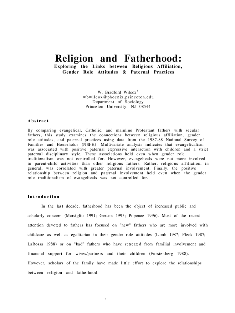Religion and Fatherhood: Exploring the Links between Religious Affiliation, Gender Role Attitudes & Paternal PracticesW. Bradford Wilcox* wbwilcox@phoenix.princeton.edu Department of Sociology Princeton