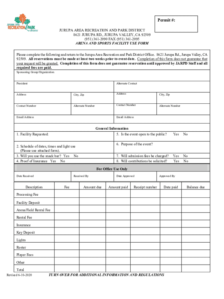 Este formulario es utilizado para solicitar el uso de instalaciones recreativas y deportivas en el área de Jurupa. Complete y devuelva este formulario a la oficina del distrito, asegurándose de