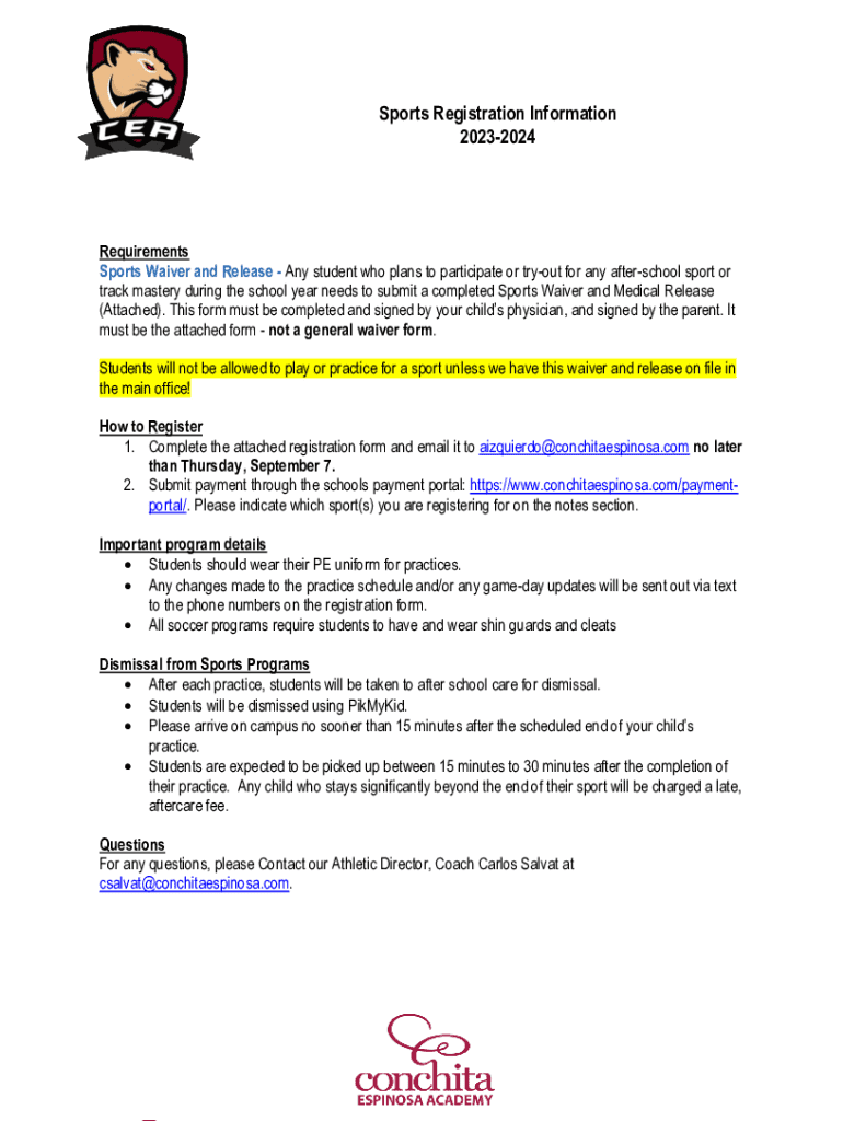 This document outlines the requirements and procedures for registering students for sports programs at Conchita Espinosa Academy. It includes details on necessary waivers, registration forms, payment