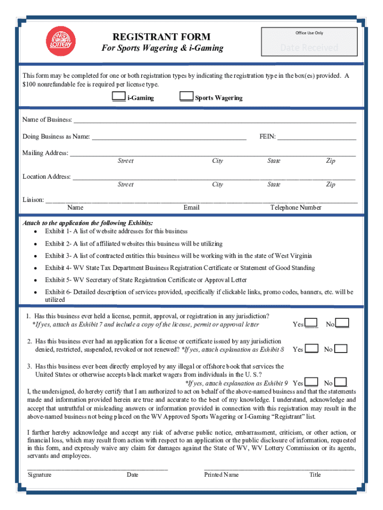 This form is for marketing affiliate companies to register as a \'Registrant\' for sports wagering and/or interactive wagering (i-Gaming) in West Virginia. It includes requirements for submission,