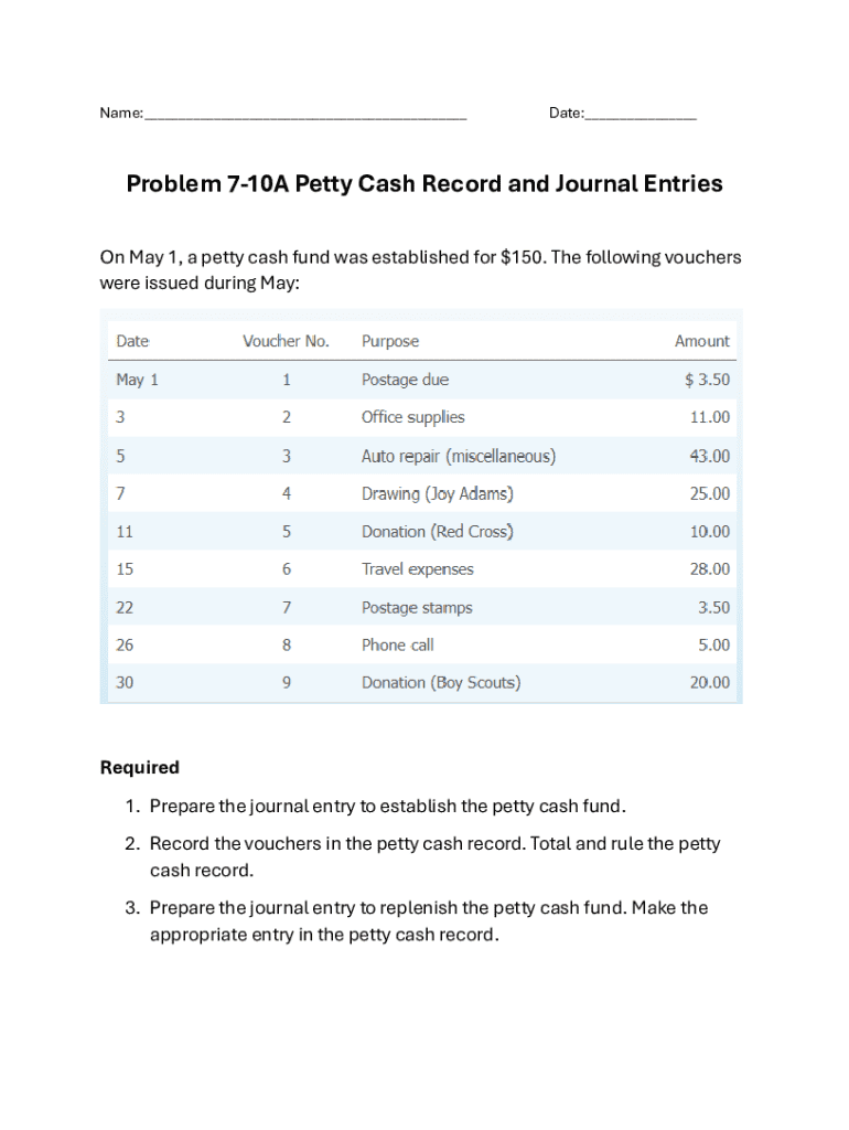 Name:___Date:___Problem 710A Petty Cash Record and Journal Entries On May 1, a petty cash fund was established for $150. The following vouchers were issued during May:Required 1. Prepare the journal