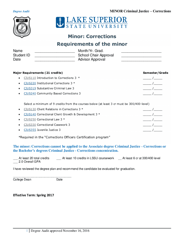 This document outlines the requirements for the Minor in Criminal Justice - Corrections, including necessary courses, credit requirements, and approvals needed for graduation.