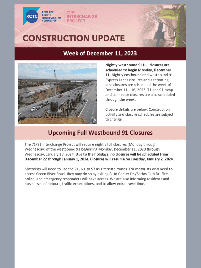Week of December 11, 2023 Nightly westbound 91 full closures are scheduled to begin Monday, December 11. Nightly eastbound and westbound 91 Express Lanes closures and alternating lane closures are