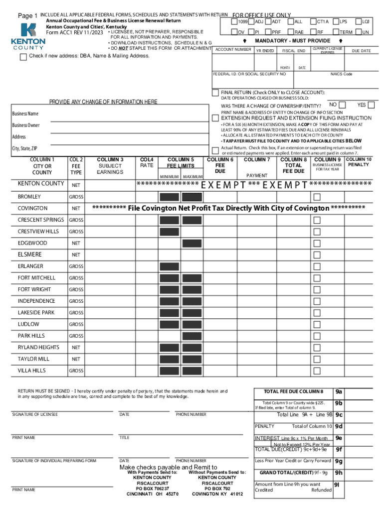 This form is used for the annual renewal of the business license and occupational fee in Kenton County, Kentucky. It includes sections for reporting income, payment due, and changes in ownership or