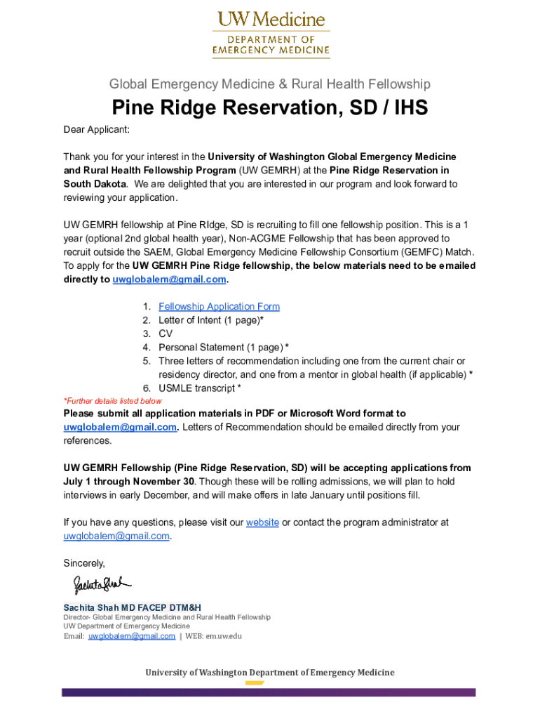 Application form for the Global Emergency Medicine and Rural Health Fellowship Program at the Pine Ridge Reservation, South Dakota, hosted by the University of Washington, providing details about