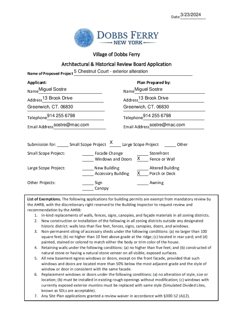 This application is for projects requiring review by the Architectural & Historical Review Board in the Village of Dobbs Ferry, including small scope and large scope projects such as facade changes,