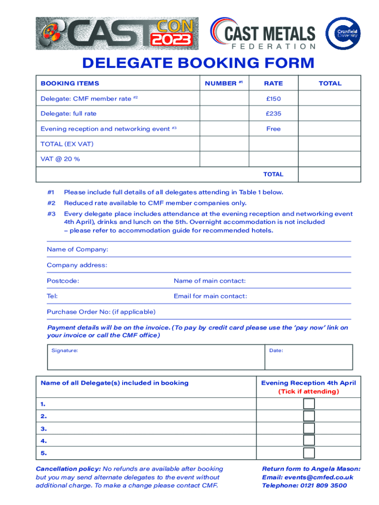 This form is used to book delegate places for the CMF event, including a networking reception. It provides options for different rates and requires details about the delegates attending. It also includes