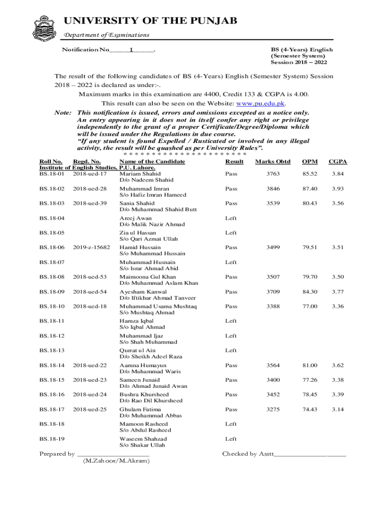 This document notifies the results of candidates enrolled in the BS (4-Years) English program under the Semester System for the session 2018 - 2022 at the University of the Punjab. It details the