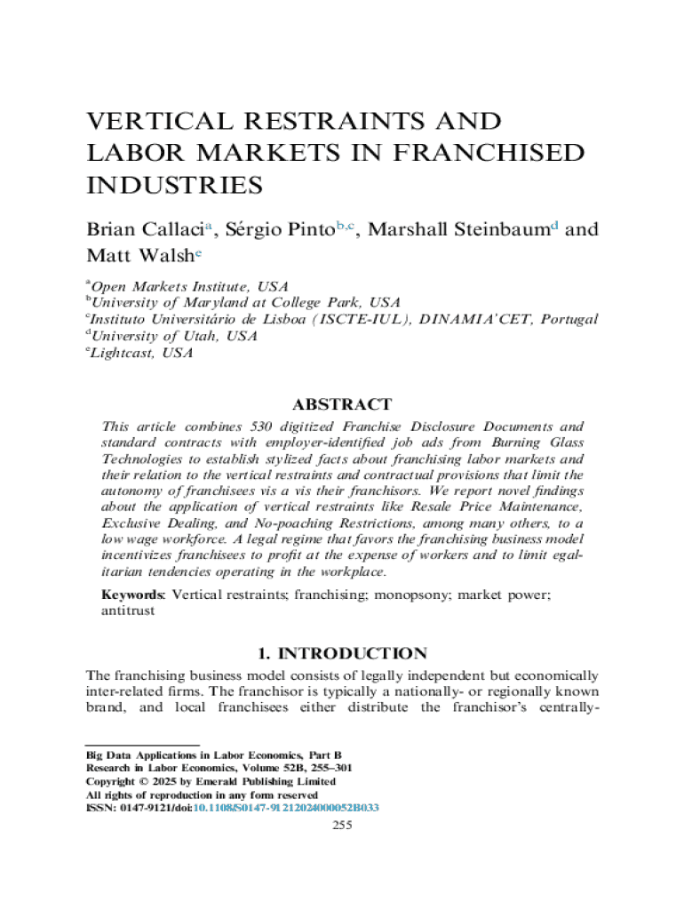 VERTICAL RESTRAINTS AND LABOR MARKETS IN FRANCHISED INDUSTRIES Brian Callacia, Sergio Pintob,c, Marshall Steinbaumd and Matt Walshe aOpen Markets Institute, USA University of Maryland at College Park,