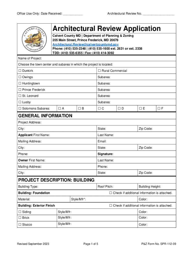 This document is an application form for architectural review for projects in Calvert County, MD. It includes sections for project details, applicant information, building descriptions, and required