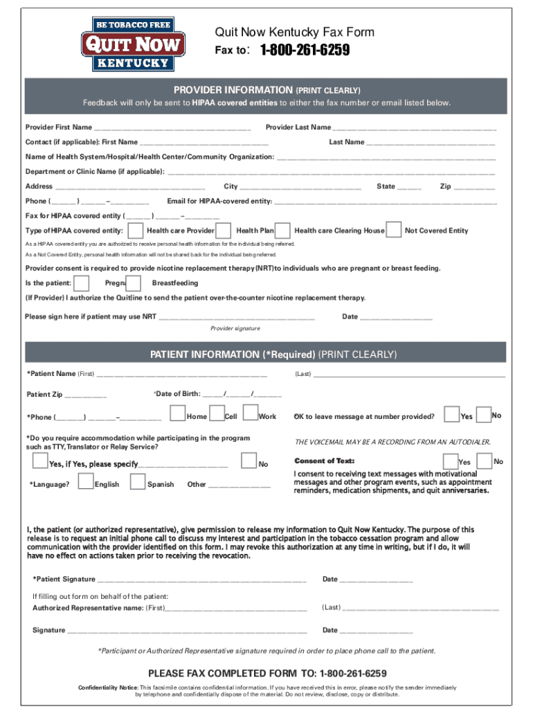 Quit Now Kentucky Fax is a program designed to assist individuals in quitting smoking and tobacco use in the state of Kentucky. It provides resources and support through fax communication.