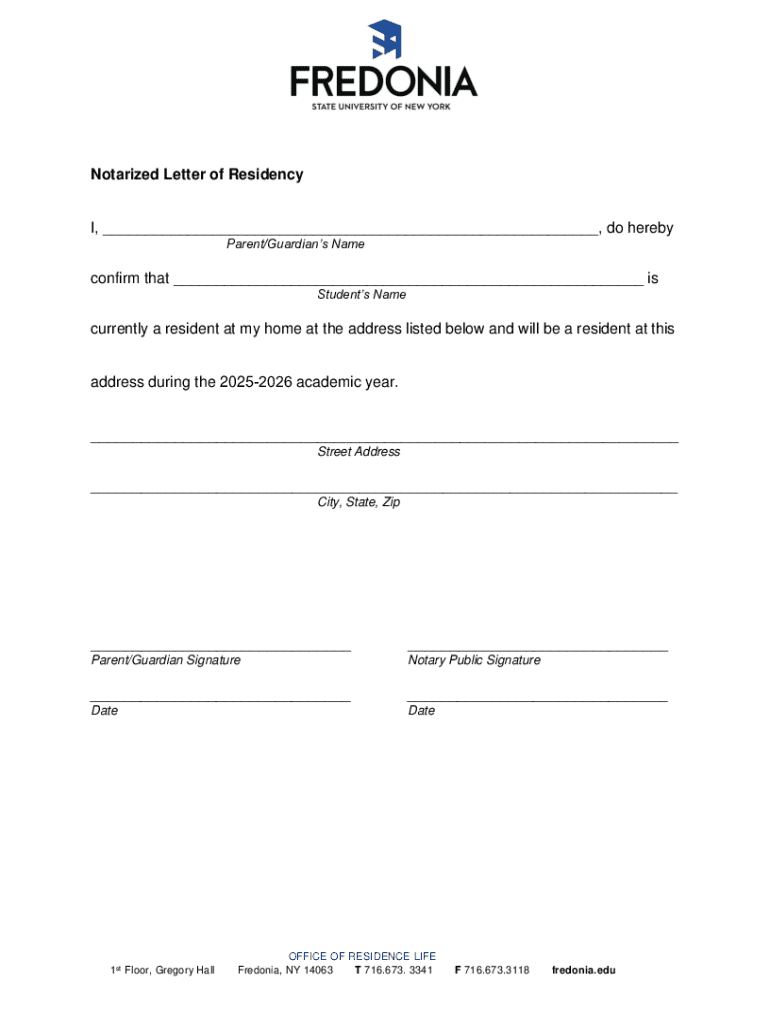 To fill out a notarized letter of residency, you should provide your full name, current address, date, and any relevant identification details. The document should then be signed in the presence of a notary public, who will validate it.
