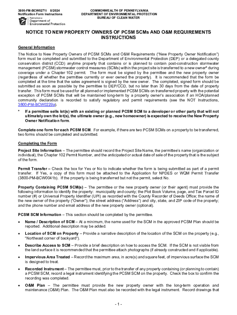 El formulario de notificación a nuevos propietarios de PCSM SCMs y requisitos de O&M debe completarse y presentarse al Departamento de Protección Ambiental (DEP) o a un distrito de conservación