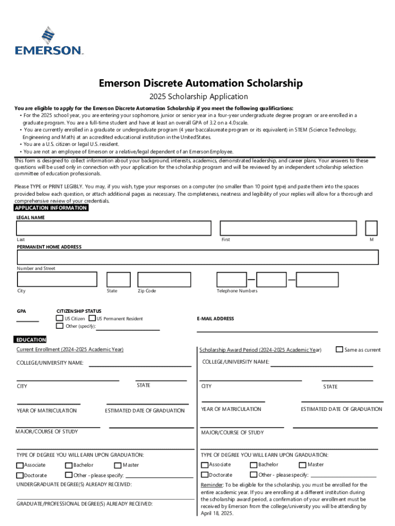Visit the Emerson Discrete Automation scholarship webpage to download the application form.