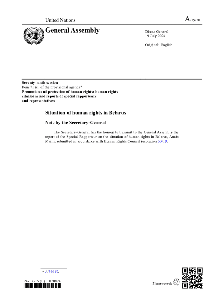 This document presents a report by the Special Rapporteur on the human rights situation in Belarus, examining the country\'s engagement with UN human rights bodies and mechanisms, assessing the deterioration