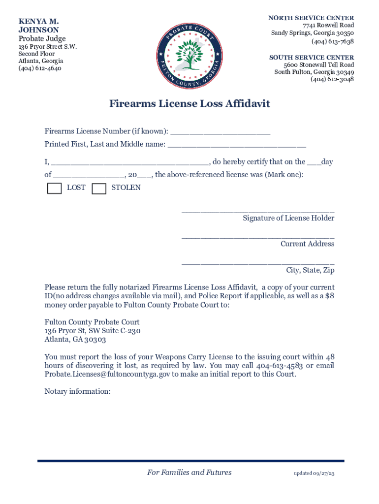 This affidavit certifies the loss or theft of a firearms license and outlines the necessary steps to report it to the Fulton County Probate Court.