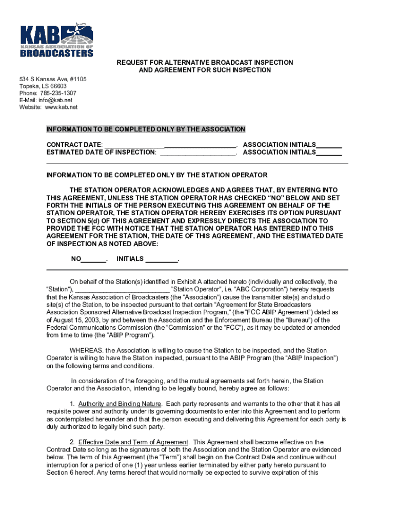 REQUEST FOR ALTERNATIVE BROADCAST INSPECTION AND AGREEMENT FOR SUCH INSPECTION 534 S Kansas Ave, #1105 Topeka, LS 66603 Phone: 7852351307 EMail: info@kab.net Website: www.kab.netINFORMATION TO BE